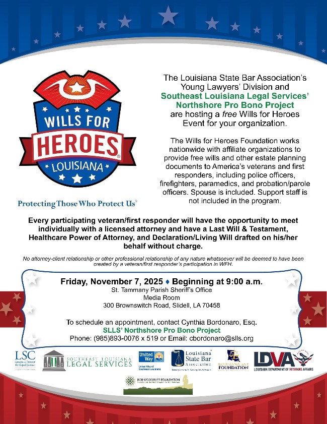 This Wills for Heroes event is for both veterans and first responders. Can you please help us spread the word by distributing it to St. Tammany and Washington Parishes’ first responders and/or veterans?